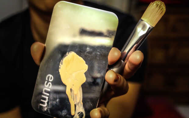 Para convertir a sí mismo en un lagarto, usted necesitará:pinturas de la cara (estoy usando paleta de FX de hermanos Wolfe & Kryolan Aquacolors)sombras de ojos pigmentadas, convierten en negros, marrón, diferentes tonos de verde, amarillo y moradoeye