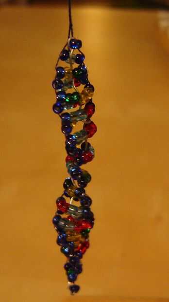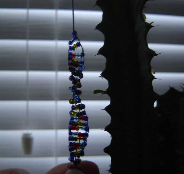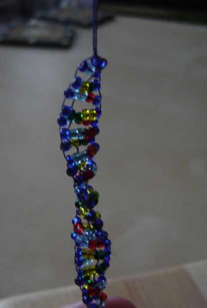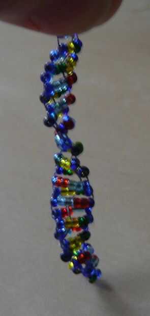 ADN a menudo es representado en un modelo simplificado con cintas que representan la columna vertebral de azúcar-fosfato y barras y a los pares de bases. En este instructable le mostraré cómo hacer un modelo simplificado con hilo y cuentas de vidrio de color (lo sentimos no hay enlaces del hidrógeno aquí). Puede utilizar para la decoración, colgar en una ventana, llaveros o un regalo para su favorito biólogo molecular.