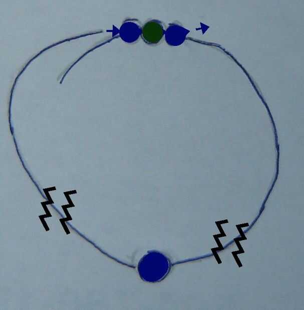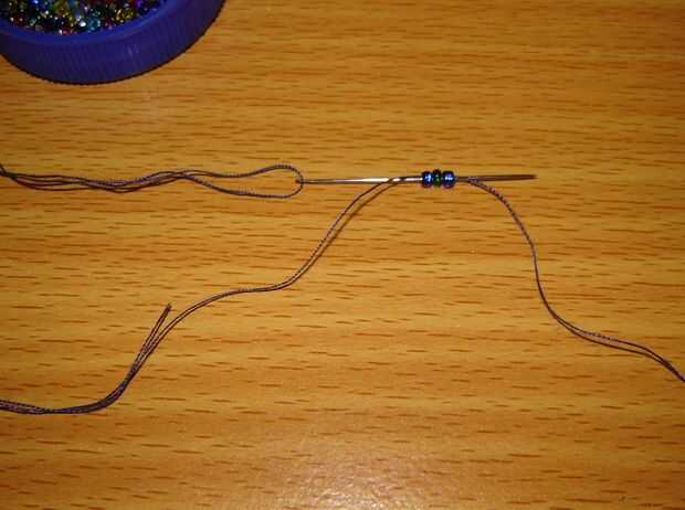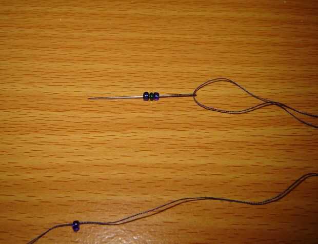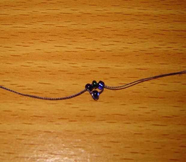 • Enrosque un extremo de la cuerda a través de las siguientes tres cuentas, tire a través hasta que estén en medio de la rosca. (ver imágenes abajo)