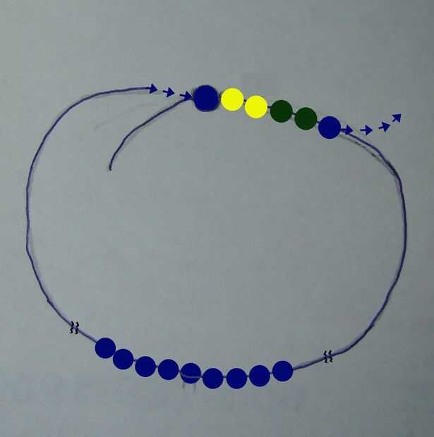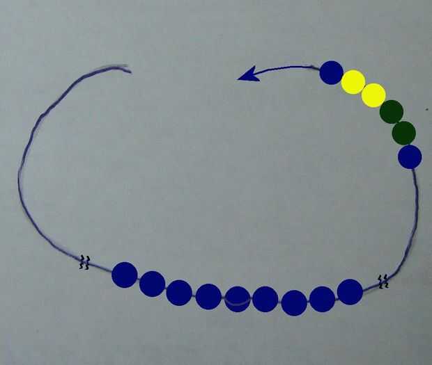 • La primera fila consiste en granos de 6, los dos exteriores son las mismas que en el paso anterior, que será la columna vertebral de azúcar-fosfato (azul oscuro), el medio son los pares de bases; dos bolas de cada color en este caso dos amarillos y dos cuentas verdes. (Véase mi patrón de color en el paso 5)