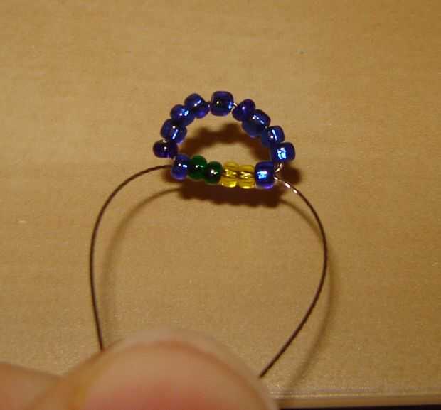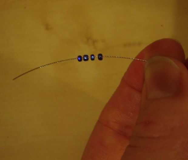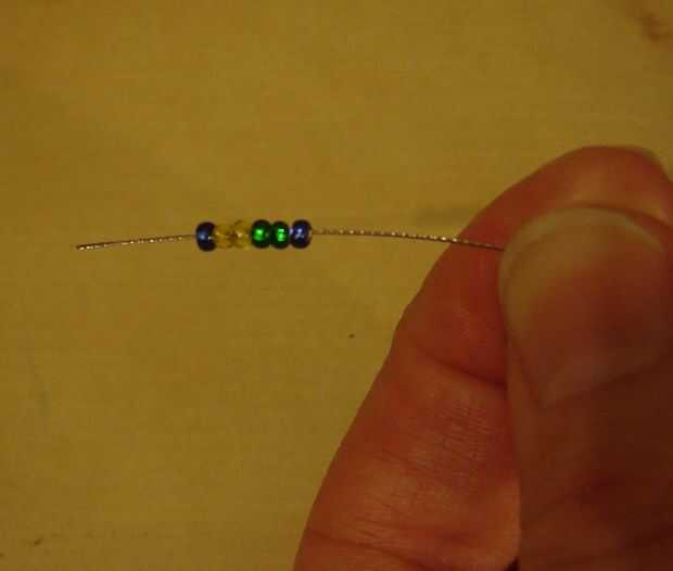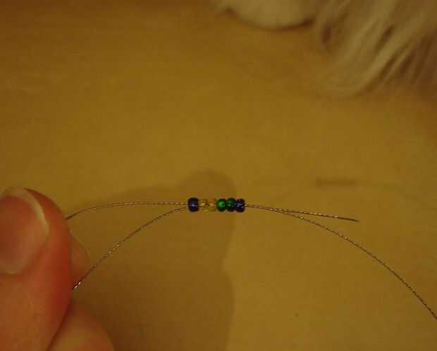 • Hilo de rosca cuatro granos (el mismo color que el primer grano) a través de cada uno de los extremos de dos hilos (son espaciadores de final).