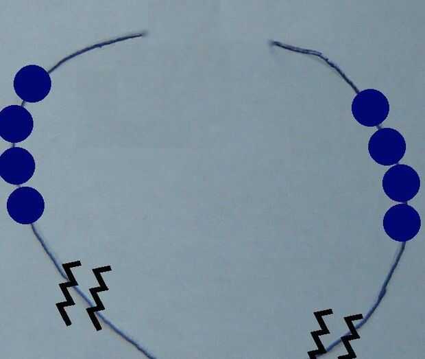 • Hilo de rosca cuatro granos (azul oscuro) a través de cada uno de los extremos de dos hilos.