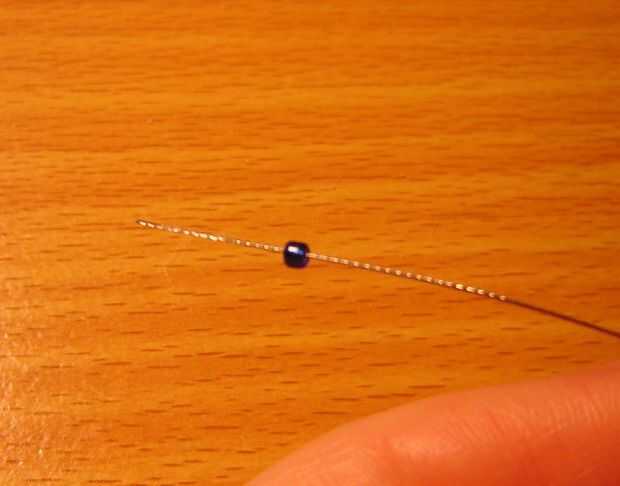 • Enrosque un extremo del cable a través de la cuenta pasada (otra vez, azul oscuro), tire a través para reunirse con abalorios espaciador.
