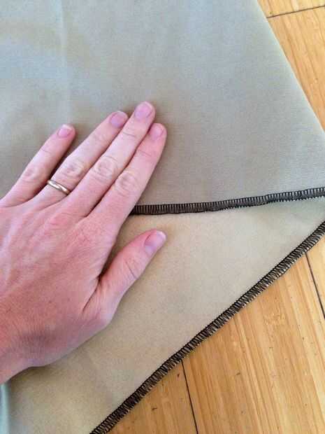 Doblar una tira en medio hacia fuera maneras de largo, el lado brillante y coloque encima un pedazo de mate hacia arriba. Coloque el borde doblado contra uno de los bordes serged y coser las dos piezas como se muestra en la foto 4 de arriba.