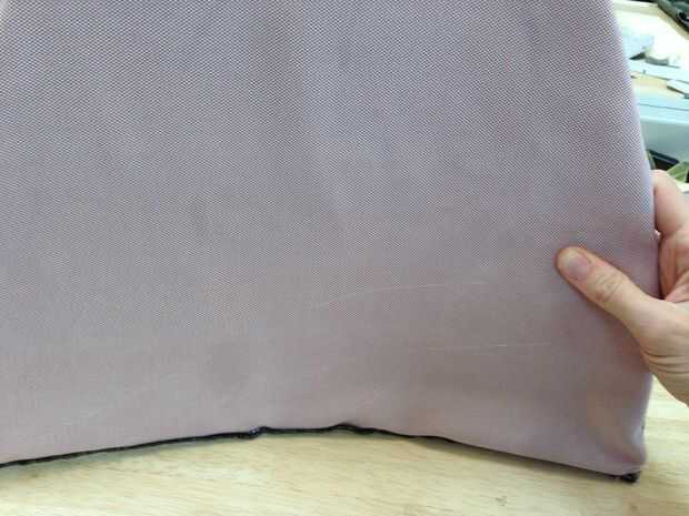 Corte una tira de cada tejido (color de rosa y de color arena) para que coincida con las piezas bucales, con sobre un margen de costura de 1/2"- 1" en todos los lados. (Nótese que la costura en mi tela color arena no era una opción estética, simplemente había convertido toda la tela a tiras de 12" y tuvo que combinar para adaptarse). Bordes de sarga para evitar deshilaches.