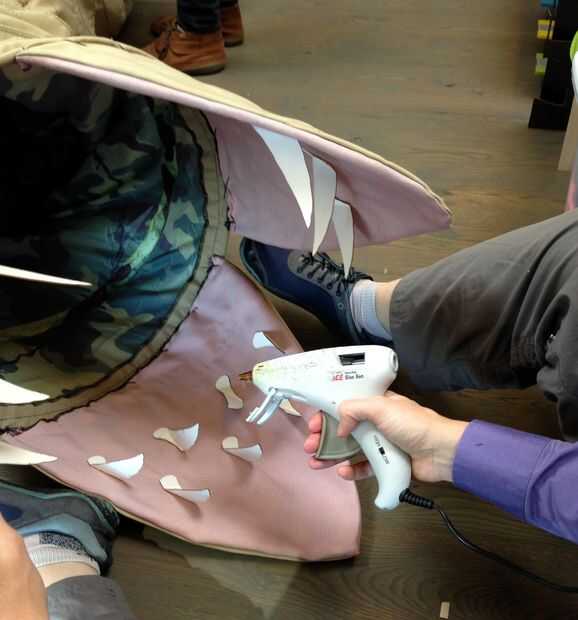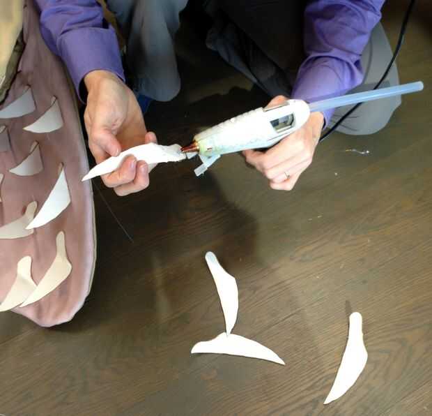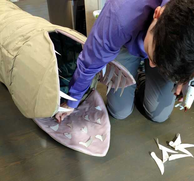 Tenga en cuenta que los dientes necesitan curva hacia adentro para impedir que la presas escapar *, y necesita pegar lo suficiente como para parecer amenazante, pero no en 90 grados o a meter los ojos hacia fuera. (La cartulina es bastante fuerte). A perder unos dientes consiguiendo el doble exacto, pero una vez que tienes un modelo es fácil de replicar.