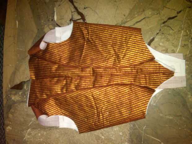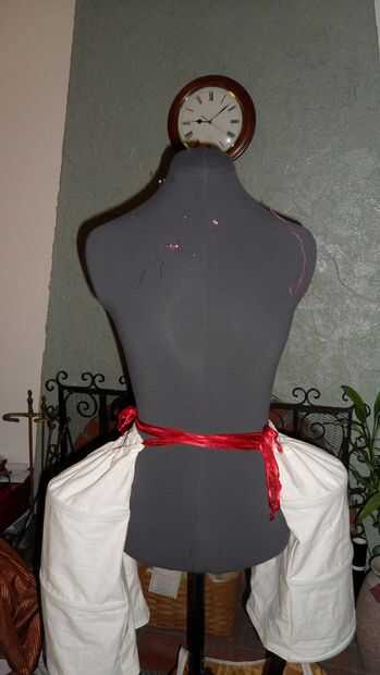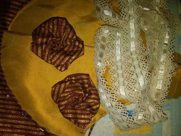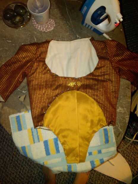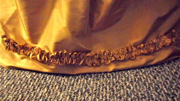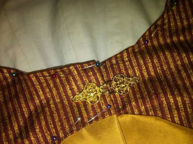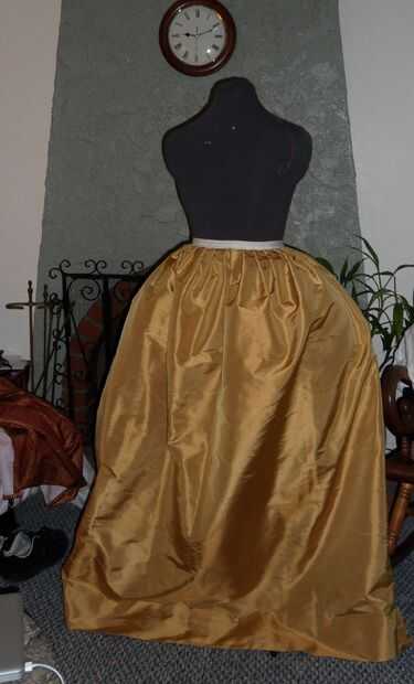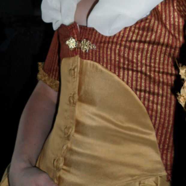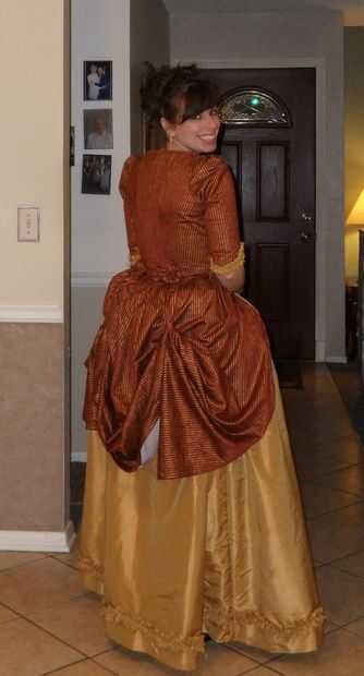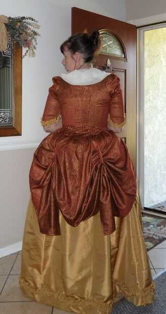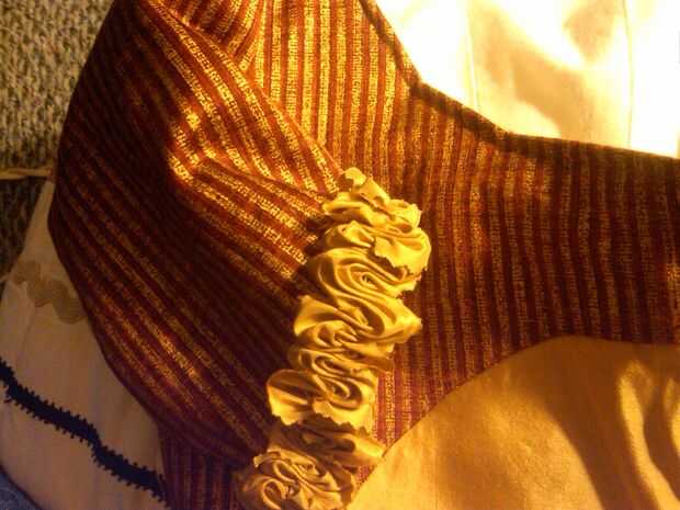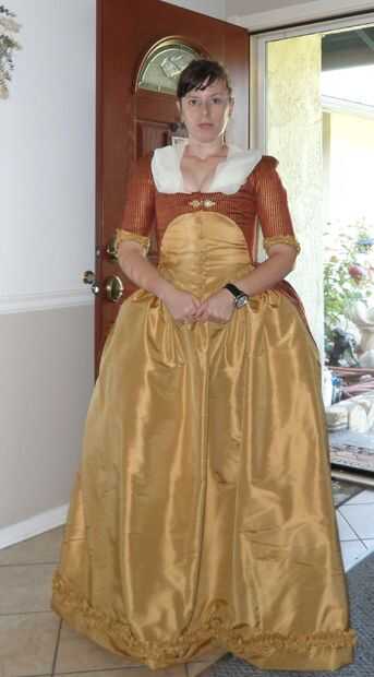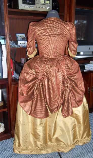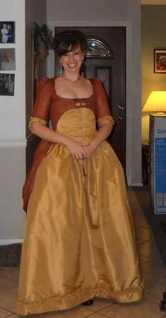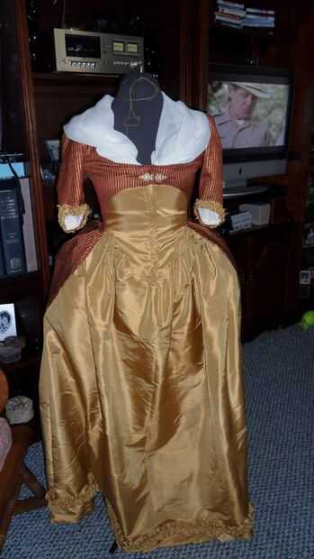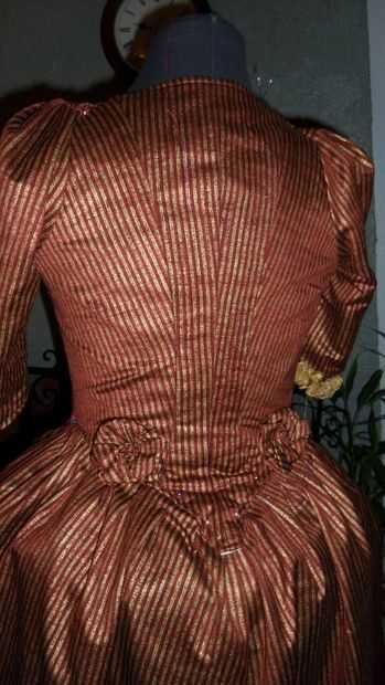 En la película ella vestía una túnica frente hermosa zona rayada una l. En cuanto lo vi, tenía que hacerlo!!!! Fue bastante el esfuerzo porque nunca había hecho un vestido de elaborados antes. Usé una herrumbre y oro rayas de algodón para el traje y el oro tafetán para el frente de la enagua y zona. También solía muselina y deshuesado para crear aros de bolsillo para el vestido de la featherlight pone derecho. Usando tijeras dentadas, también cortado y cosido auténtico volante acanalada para la parte inferior de la falda y las mangas. Hice mis propios botones oro Tafetán y cosido de los ojales para la zona cierre adelante y utilizan un cierre de metal oro antiguo. Hice a rosas de tela para la cintura trasera a polonesa la falda.