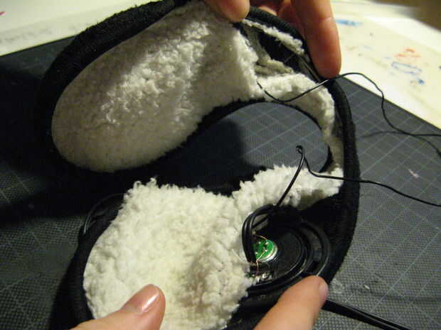 Ahora que los cables y altavoces en las orejeras a través del agujero superior y poner un cable de entrada a través del orificio en la parte inferior. Luego coser ewerything detrás juntos, y sus Earmuffones se acaban!