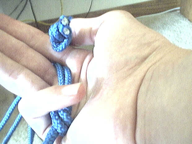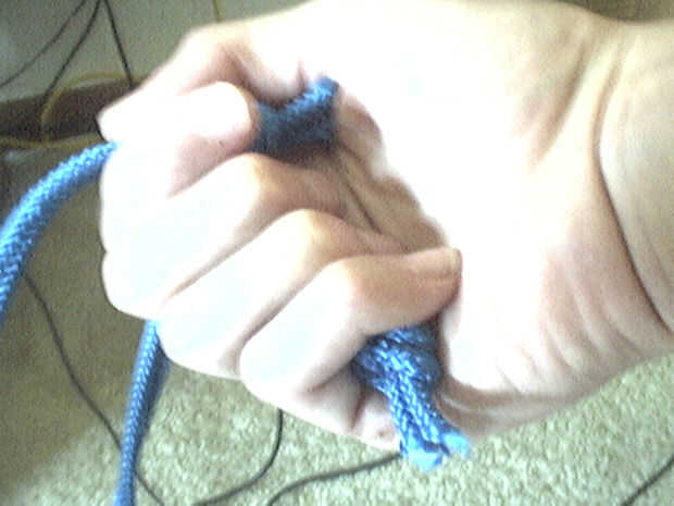 tomar su mano dominante y uno de los nudos entre el medio y el dedo índice de la alimentación. llevar el nudo a su pinky y sujete el nudo suavemente allí. traer el otro nudo entre el puntero y el pulgar y pellizcar allí. Ahora, cierre su mano en un puño.