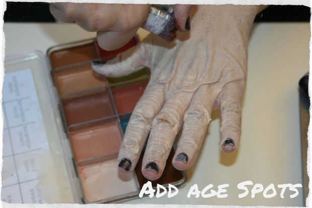 Con un cepillo de dientes o salpicaduras, cargar el pincel con pintura marrón y dibuja el pulgar a lo largo de las cerdas a Gore de la mano. Intente esto con varios colores diferentes y tratar de mover el pincel más cerca y más lejos de la piel para crear manchas de la edad de aspecto realista. También puede conseguir este efecto utilizando diferentes colores de delineador de ojos marrón si no tienes ninguna pintura.