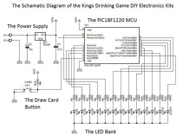 El PIC18F1220 actúa para seleccionar al azar que la salida se encenderá después de detecta que el usuario ha pulsado el botón dibujo de la tarjeta. Ha sido programado con un código especial que desarrollé. Cuando alguien presiona el botón de selector de tarjeta, el MCU detecta y se enciende uno de los 13 LEDs. El código está disponible en la siguiente sección.