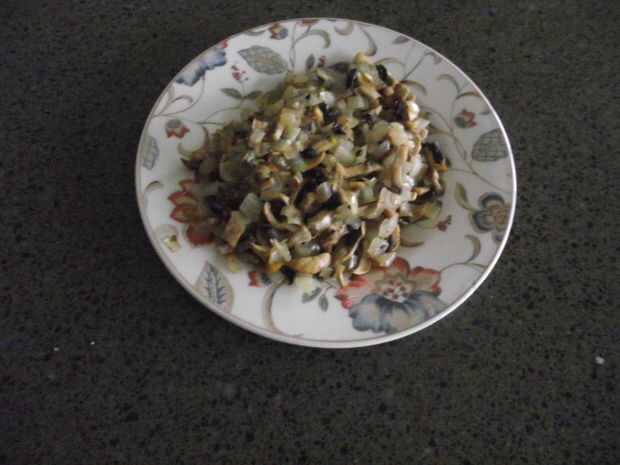 Pica una cebolla mediana y 3-4 setas grandes y sudar en una cacerola que fríe en una cucharada de aceite de oliva