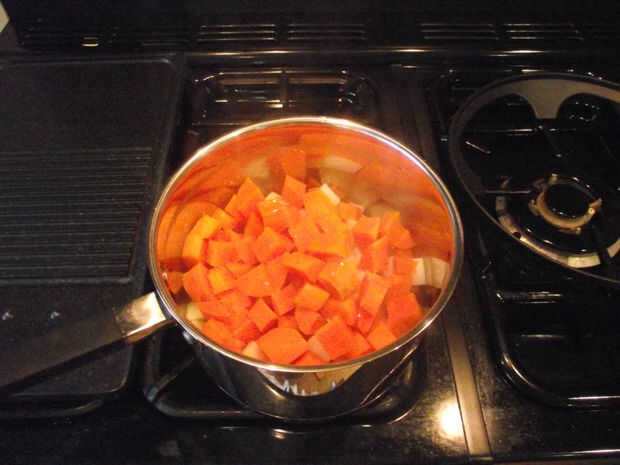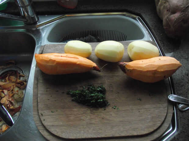 Peladas 2 medio Kumara (camote naranja) y 3 patatas medianas, cortar en cuadritos y cocidos al vapor hasta _ suave unos 20 minutos.