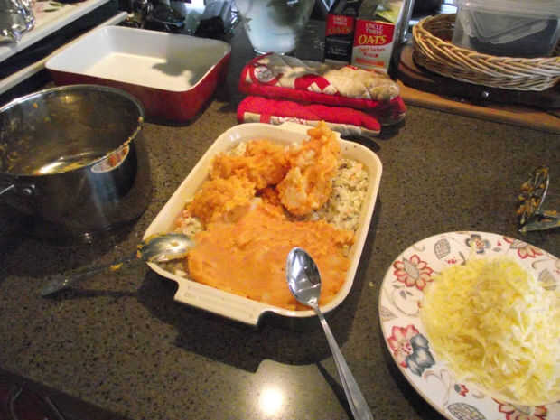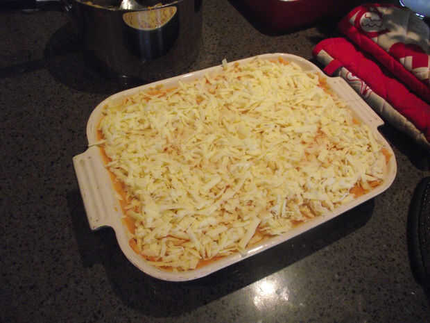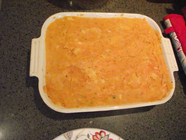 Pongo el puré de patata Kumara en la parte superior y remata con 100grams de queso rallado (cheddar en este caso se hornean en el horno durante unos 30 minutos a 250C hasta que el queso derrita y Dore.