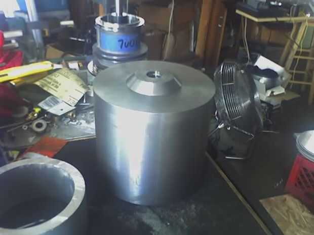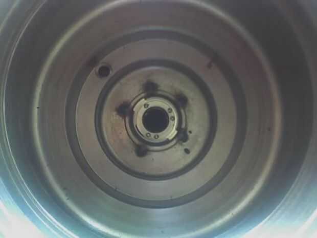 En esta foto se pueden ver las partes principales del alternador y de la vivienda en el Banco de trabajo el gran tambor de acero es la cubierta para el alternador. Detrás de esto con la cinta azul es el conjunto de alternador, eje y cartucho con sellos. Esto simplemente se desliza dentro de la vivienda y se cabe con la fricción que los cojinetes están en el frente de esta vivienda se puede ver la cúpula en la parte superior del tambor es donde se inserta el cojinete hidrostático desde el interior. hay orificios en la carcasa que permiten aceite entrar en el sistema de rodamiento.