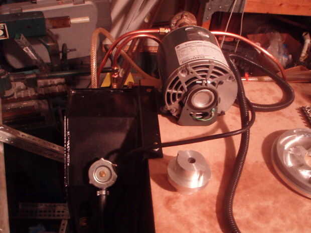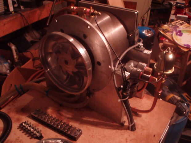 En la segunda foto se puede ver a la otra mitad del rotor, se puede ver también la herramienta de última hora que solía funcionar la turbina durante romper en fase. Tuve que correr la turbina con un motor eléctrico para romper los rodamientos. Ese pequeño pedazo redondo entra en el rotor montado y el eje del motor ajuste en el extremo. Entonces pude ejecutar el rotor y alternador durante largos períodos a baja velocidad para el sistema.