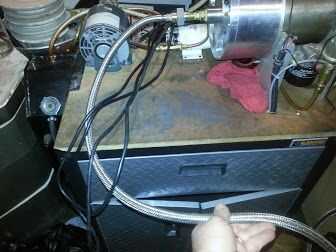 Aquí en esta foto se puede ver un primer plano de mi línea de alta presión. Se trata de construcción de acero inoxidable, trenzada con una rápida desconexión en la turbina de entrada. esta línea es de aproximadamente 10 pies de largo y está a cargo de mi generador de vapor. La explosión de esta línea son más de 10.000 Psi. más de 700 grados de alta temperatura. Cosas muy fuerte y durable. No quiero tener vapor mortal excape y me corte por la mitad mientras admira mi trabajo. Así que edificara este sistema.