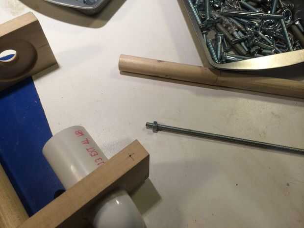 El caño de PVC se desliza hacia arriba y hacia abajo para la carga de la botella, así que necesitaba un mecanismo de fijación para mantenerlo todo firmemente cuando esté en uso. Esto se logró mediante el uso de varilla de 1/4' roscadas una tuerca y chatarra de espiga.