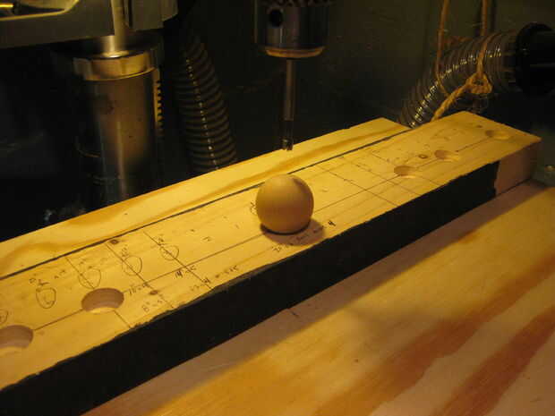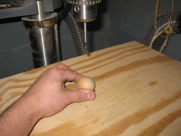La solución rápida es hacer un agujero en un tablero, que es más pequeño que la esfera. luego coloque la esfera en el orificio y lejos del taladro. Como usted no mover el anteriormente mencionado tablero, debe ser bueno para ir. Esto es lo que hice con los soportes de casco... entonces quién sabe qué pasó con ese tablero. Probablemente una tabla de sacrificio, para la prensa del taladro o Hanon... luego en el calentador.