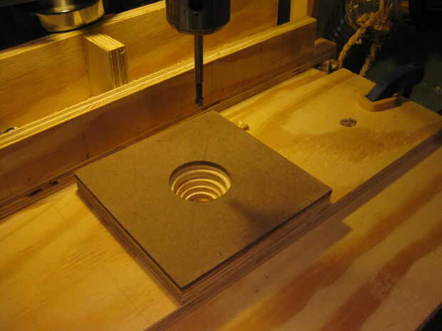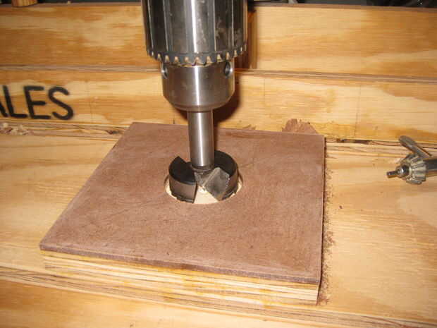 Comenzar con la broca más grande y su manera abajo. Es mi mayor pieza Forstner 2" por lo es mi punto de partida. Perforé a través de la madera prensada y una sola capa de la madera contrachapada. Luego pasó a la siguiente broca menor y perforado dos plys más... repetir hasta que su corazón está contento. Personalmente hice 2", 1 3/4", 1 1/2, 1 1/4" y 1".
