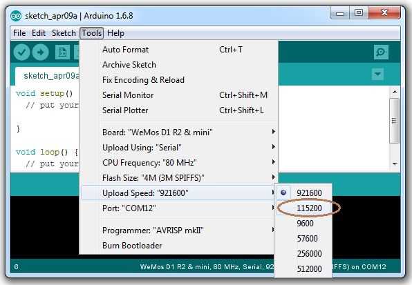 En un paso 9 habíamos determinado el puerto COM en que wemos-D1R2 aparece. Para seleccionar el puerto COM, vaya a herramientas | Puerto: y seleccione el Puerto COM, en mi caso fue COM12.