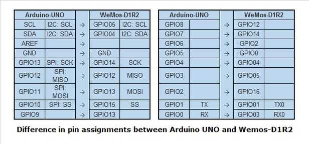 Aunque el Arduino UNO y la D1R2 de WeMos son similares, existen algunas diferencias en la asignación de pines. La figura anterior proporciona la asignación de los pines. En algunos programas de situaciones para la ONU tendrá que modificarse un poco para las asignaciones de pines adecuada de WeMos-D1R2. Más sobre esto cuando escribimos nuestro primer boceto.