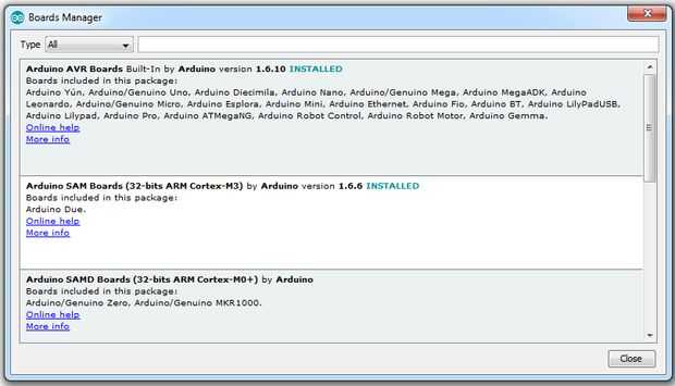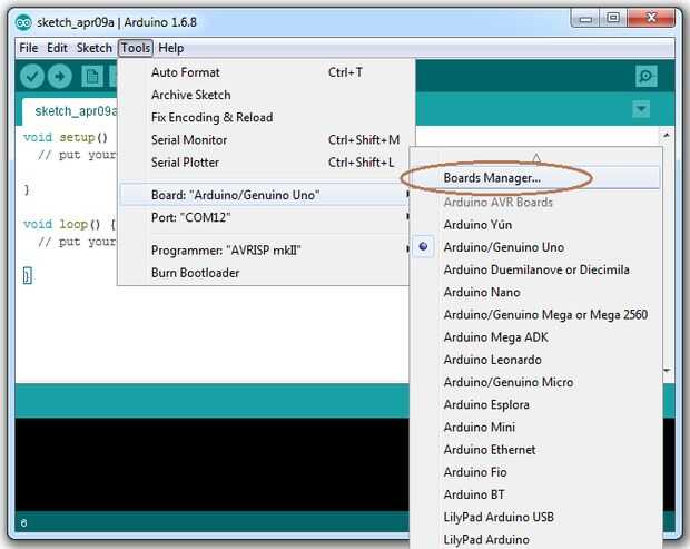 También necesita saber acerca de las herramientas | Tablero :… | Cuadro de diálogo Administrador de tablas . Tienes una versión anterior del software de Arduino si no puede ver Junta Manager en el menú. Ir a actualizar el software.