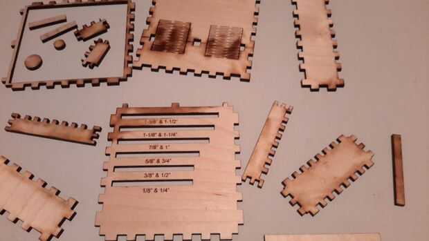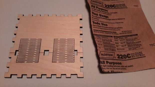 Ahora viene la diversión parte, bueno al menos lo que considero la diversión parte. Lijar! Se utilizó papel de arena de grano 220 y fue a la ciudad. Todas las marcas de quemaduras de láser exceso desaparecen por arte de magia. Apenas tuvimos ninguna marca de quemadura en las plantillas propias, más fueron pronunciados en las piezas de la caja, así que asegúrese de lijar las partes que quieres retocar. Es como borrar todos los errores! Por qué probablemente no tenía cualquier borrador dejado sobre mis lápices cuando estaba en la escuela. Me estaba preparando para todo el lijado que iba a hacer más adelante en la vida. Para la pieza de madera con bisagras se utilizó un compresor de aire para limpiar el polvo y hacer la vida más fácil.