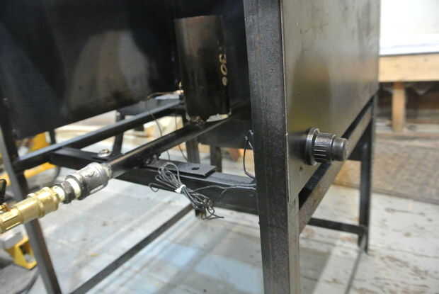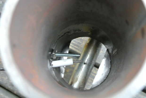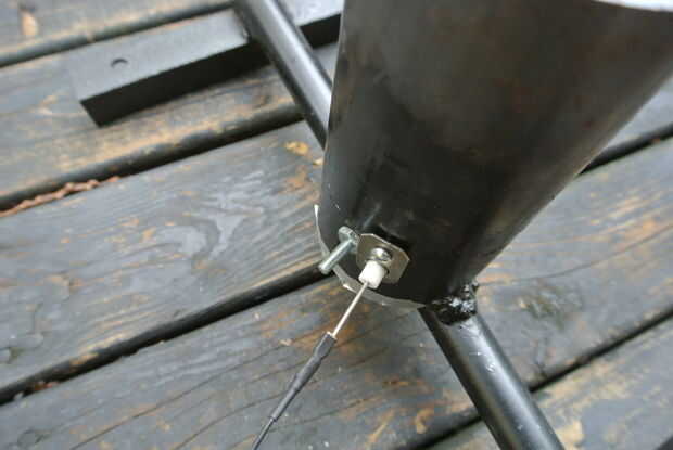 I taladrar dos agujeros en el lado del tubo del quemador e inserta la varilla de electrodo de ignición y utiliza un tornillo como una placa de conexión a tierra. Como se puede ver en la foto, produce un arco agradable. Me aseguré de que estaba en el borde de la vía donde pasa el propano pero no directamente en la parte más caliente de la llama.