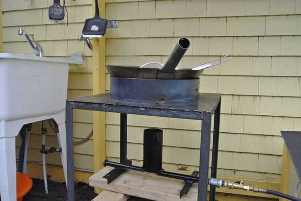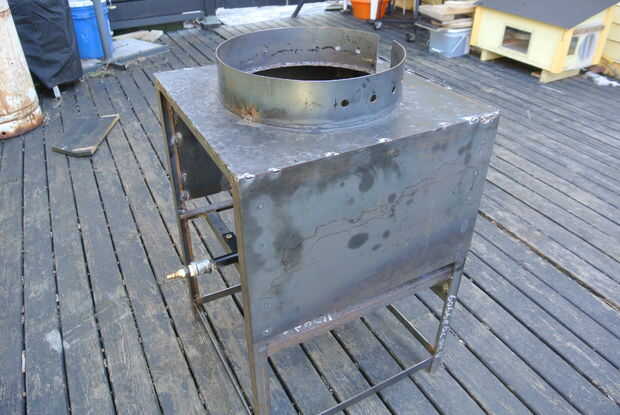 Determina la altura de donde se debe montar el quemador mediante el uso de algunos bloques para subir y bajar el quemador para encontrar la altura óptima de donde la llama se une con el fondo del wok. Luego utiliza un ángulo de hierro y soldadas a la base y algunos agujeros perforados y había montado el quemador con algunos tornillos.