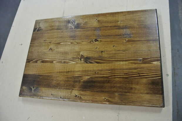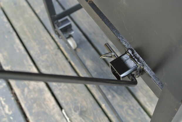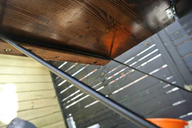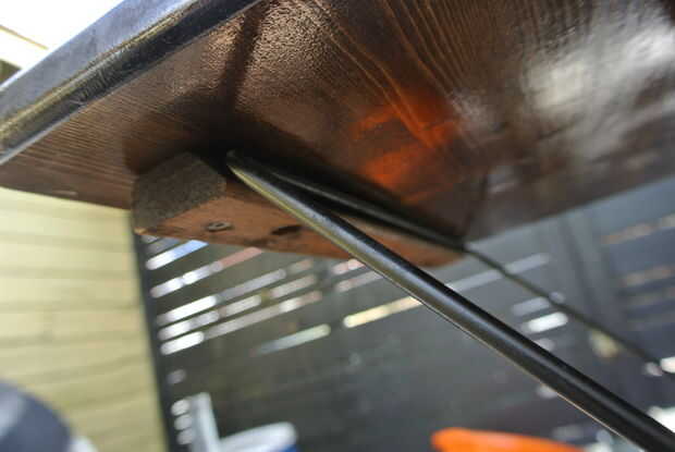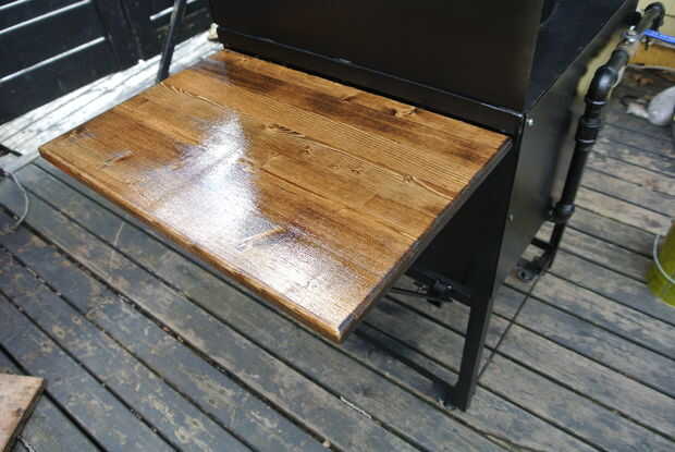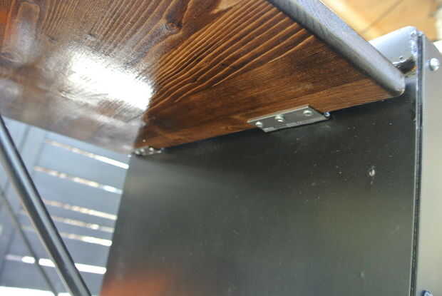 Se agregó una mesa plegable, teñido nogal y luego aplica unas capas de barnizado y una cala francés fue instalado de manera que una barra de metal se podría utilizar para mantenerlo vertical. Las bisagras fueron atornilladas a los lados de la base. Una pieza de 1/4" redondo acero stock fue calentada y doblada en forma de"u", ver las fotos de exactamente cómo hacerlo. Salió muy fuerte y robusto.