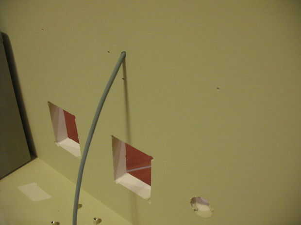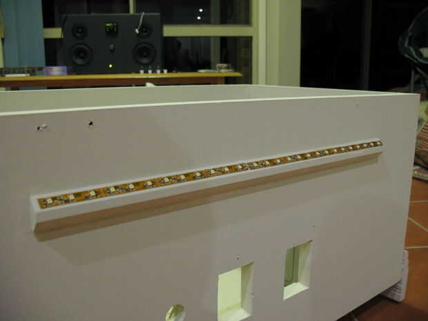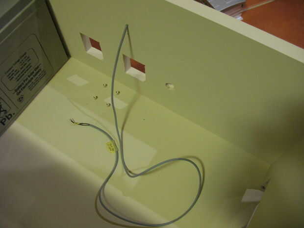 Coloque la tira de LED en el listón. Los LED son hacia arriba para que la luz 'lava' la pared detrás de la estación de energía. Inserte un cable de 2 hilos a través de un pequeño agujero en la caja. La soldadura de la + VE y - VE en la tira de LED. (La tira de LED debe mostrar que es - VE y + VE).
