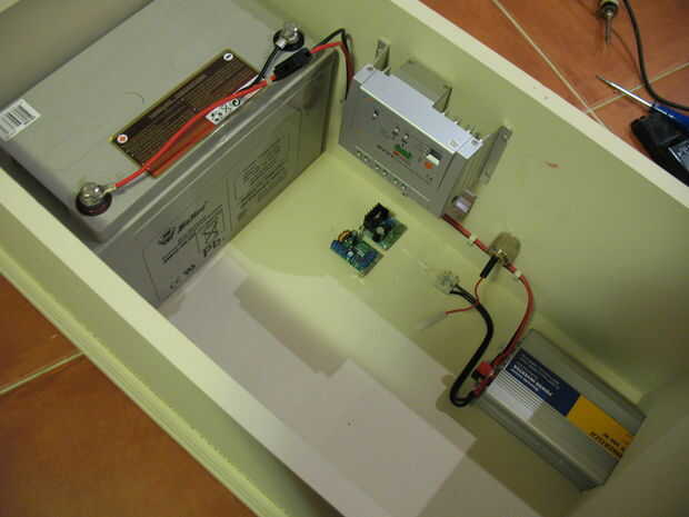 Estación de energía solar portable o de emergencia. Estadísticas: 120W (95? max hasta ahora), 12V 80Ah AGM batería solar, MPPT controlador de carga solar, inversor de 400W (utiliza 0.8 A cuando en), 3 ventiladores de refrigeración (en/hacia fuera del