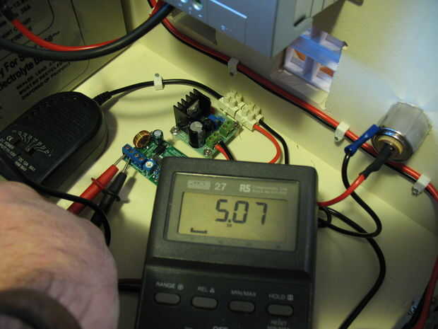 Temporalmente (y uno por uno) añadir un fusible en el circuito y prueba y los 5VDC para los cargadores USB. Hay un potenciómetro en cada placa de circuito para ajustar la tensión. Remueva los fusibles y continúe. Este proceso se debe haber completado en el Banco pero es una buena idea para probar otra vez.