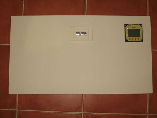 Montar la placa del cepillo y el medidor de cargador solar en la tapa. Vuelva a colocar la tapa usando las bisagras. Conecte el medidor al cargador con el cable suministrado.