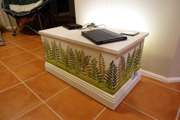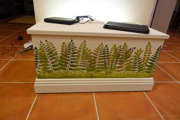 usando un rodillo de espuma y una mezcla de pintura acylic (3 tonos de verde) y uno de marrón - tengo estos materiales de una tienda de suministro de artista local. Las técnicas consiste en colocar capas de helechos con una primera capa oscura para el fondo. Esto es seguido por un color ligeramente más claro y luego una capa final de luz para los helechos en el primero plano.