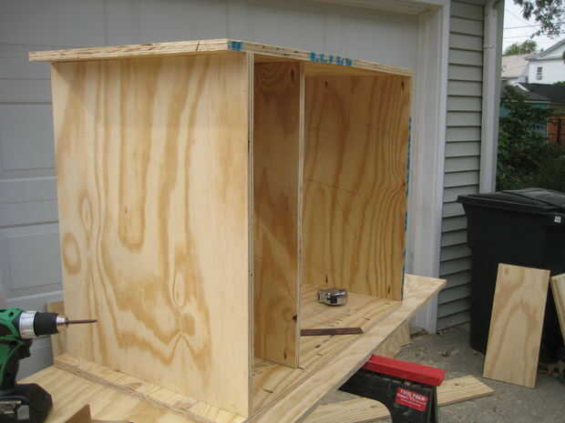 Lección aprendida #4 - sólo medimos una vez al poner la parte superior y el estante en y esto causó el uso a no prestar atención a la madera cambia de puesto mientras que aprieta los tornillos. El problema podría haberse evitado mediante el uso de determinados vicios y abrazaderas o simplemente utilizando un carpinteros cuadrado que teníamos disponibles.