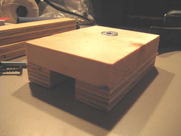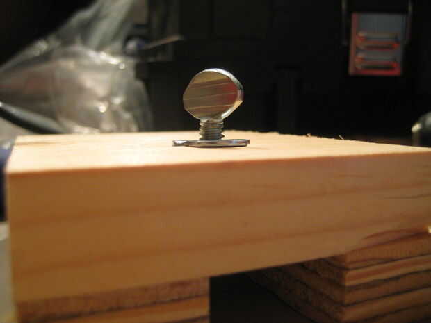 Tenía esta gran idea para poner un tornillo en una pieza de madera y luego ejecutar que lanzó un tornillo, lo que nos permite apretar en un pedazo de madera... Que no... El T-nut mantiene sacando cuando aprieta hacia abajo. Así que decidimos perforar un agujero en la pieza que nos aprieta. El agujero sería ir en la posición que el brazo de extensión alineado perfectamente con el inglete vio.