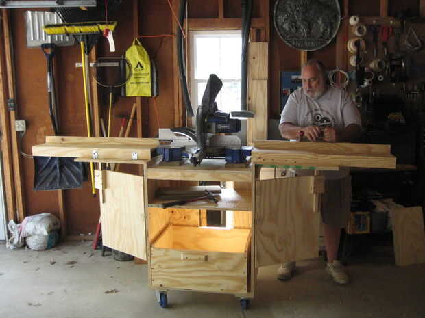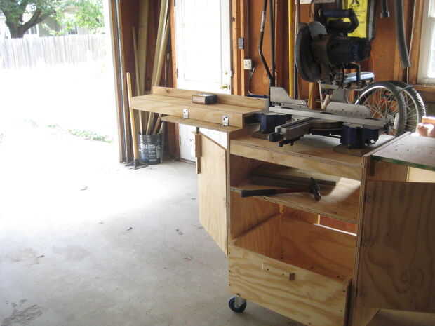 En la parte inferior de la ingletadora Sierra estación es una caja de madera. Se hizo desde la izquierda sobre la madera y puse un tirón de cajones a inglete en la parte delantera de él.