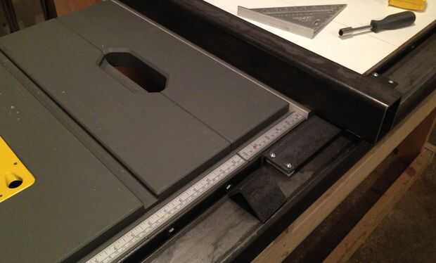 En este punto pude alinear la guía lo más cerca posible de cinta métrica (mostrado en las fotos). Alineación adicional a la hoja se logró realizar el corte en madera dura. Normalmente uno también Asegúrese de que el disco esté alineado a inglete ranuras primero, luego Plaza de la cerca. Yo había alineado la hoja con las ranuras en el pasado por lo que he podido prescindir de este paso.