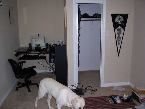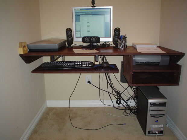 en este Instructable, te voy a mostrar cómo hice mi nuevo escritorio de la computadora con un área del armario con una bandeja desmontable teclado extraíble flotante y área oculta de la impresora; y es todo muy, muy robusto (ignorar la falta de gestión de cables). Lo que anteriormente había había hecho un trabajo bastante decente, pero sólo no maximiza el espacio que tenía donde guardo mi computadora en mi nuevo lugar. Envié la vieja unidad abajo y esto es lo que se produjo. Tenía la idea que no necesita, ni desea incluso, piernas (en el escritorio, no mi cuerpo). No hay para las piernas porque es este escritorio en un rincón. Así es realmente el golpeador aquí... Si no tienes un rincón donde se desea que su ordenador, entonces me temo que este escritorio no es para ti. Usted tendría que construir un armario de pared en un lateral f la habitación, o tener suerte como yo. Hay ciertamente mejores alternativas en este sitio. Como un montón de Instructables, este es servir a un propósito muy específico. Pero siempre, alguna idea de esto desea y ellos hacen en su propia estructura (especialmente el cajón extraíble de teclado). Mamá me enseñó a compartir.
