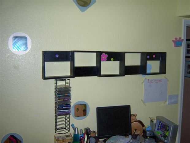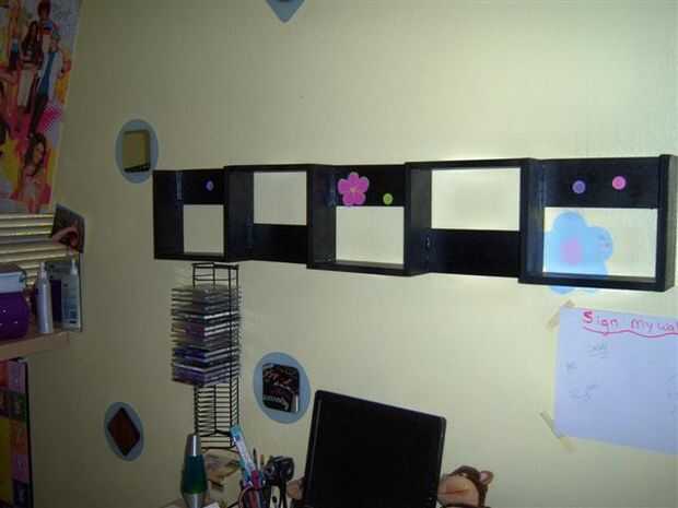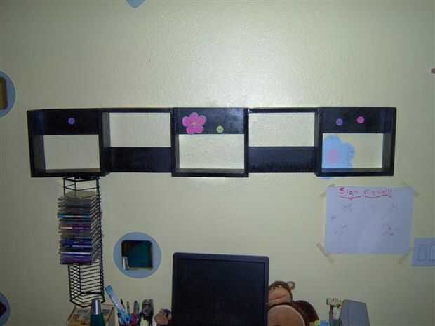 Taladré agujeros en las placas posteriores de la plataforma que están al ras con la pared, hizo los agujeros empotrables ocultar los tornillos luego pone esos poco pegatinas coloridas y flores sobre la cabeza de los tornillos para ocultarlos.