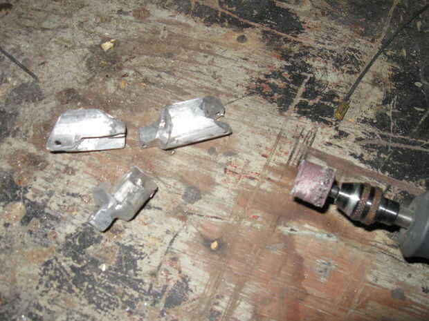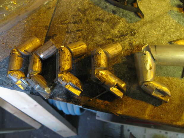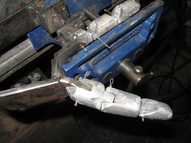 1. Seguir las imágenes y usted conseguirá la idea básica. Los dedos fueron hechos con varilla de aluminio de 3/4", y el pulgar fue hecho con varilla de 1".   Puntas de los dedos necesitan una sección en la que se fije sus ligamentos, es la pieza que se ve un poco como un clavo.  Es cortado con discos de corte dremel o si te sientes aventurero, corta cremallera de aluminio de tamaño completo.