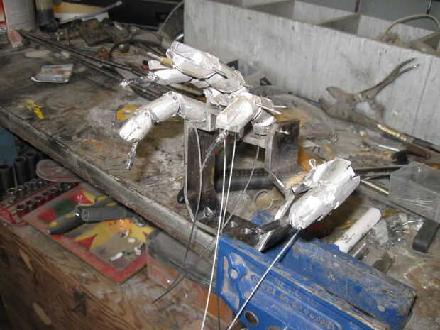 esto es un animatronic construí. Los dedos, la palma y el antebrazo están hechos completamente de madera (álamo para ser exactos). Los dedos se articulan mediante tendones (sedal) tirados por los motores. Ahora, los 5 servomotores se controlan con un