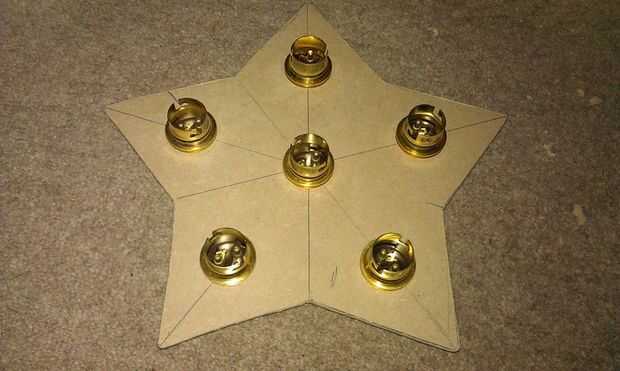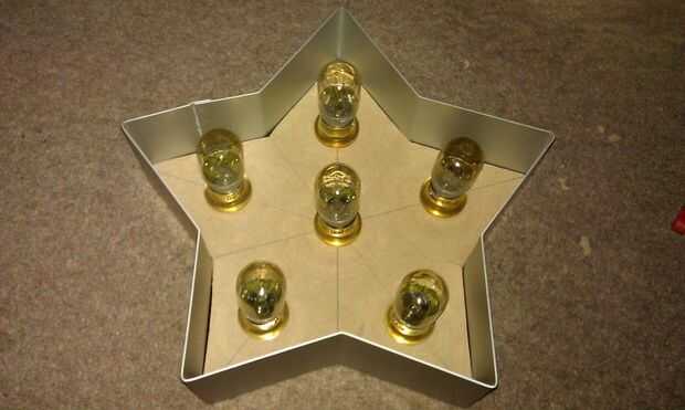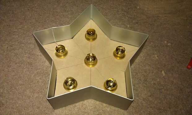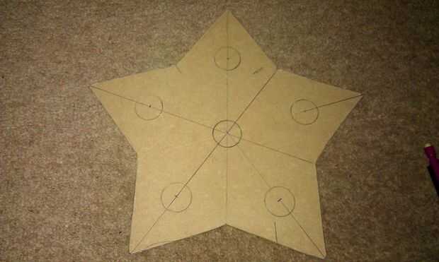 Los anillos de montaje de los soportes de lámpara desenroscarse, colocados en la base y marcados en el interior - trataba de 6cm en los puntos para mí. Para cortar los círculos, perforar tantos como puedas dentro de cada uno de los círculos y terminar con un archivo.