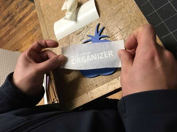 Después de la boda el diseño, utilicé la cinta adhesiva para transferir el vinilo del respaldo a la etiqueta de nombre. El truco para asegurarse de que el vinilo se pega a la divisa es para quitar la cinta con un movimiento de sheering; En lugar de tirar hacia arriba, retire la cinta adhesiva lo despegando. Si algunos de los vinilos no pegan, pista trasera un poco, empuje hacia abajo y vuelva a intentarlo.
