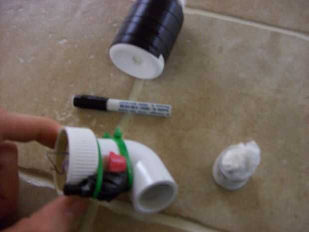 Ahora pegue la tapa de la botella de medicina para el enchufe y 90 grados PVC y fijar los cables de arriba lo que quieras crear una chispa y péguelas en su lugar. La idea es que queremos una cámara de combustión hermética. Deje que el pegamento seca.