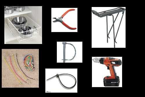 Finalmente, se necesita un taladro con brocas para perforar metal, lazos zip, cortadores de alambre, pernos de cerradura de alambre de dos y cuatro cuerdas bungee (4").
