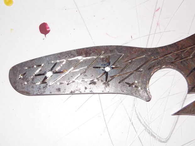 Pero en este caso utilizando acero endurecido pude no incluso abollar el acero con el taladro. Trató de "ablandar" el acero usando mi antorcha del propano, pero no se pudo obtenerlo suficientemente caliente y no tenía ningún mapa a utilizar. Así que de nuevo en la herramienta rotativa. Corté a una X aunque el tang donde quería remaches y entonces utiliza brocas de alta velocidad para hacer el agujero lo suficientemente grande para aceptar los remaches. El anotó el resto de la espiga con la herramienta rotatoria, para ayudar el epoxy para pegar al instalar la báscula.