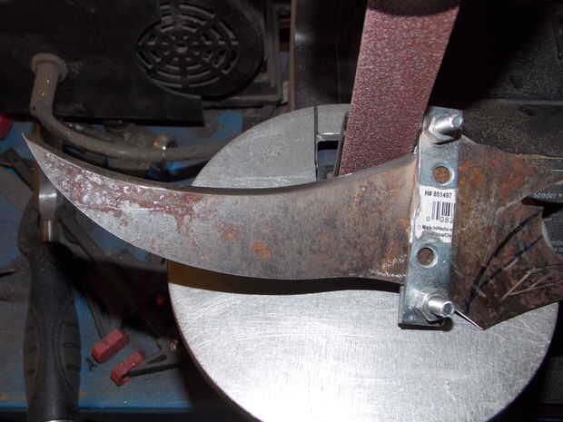 Biselado de la hoja use mi juicio y poner sobre un ángulo de 22 grados a ambos lados de la vanguardia y en un lado de la parte posterior de la hoja. Yo uso una plantilla simple construida fuera de un par de soportes rectos y unos pernos para asegurar el bisel en ambos lados de mi hoja de marcha/parada en el mismo lugar. Yo uso mi lijadora de correa/disco 1 X 30. Cuando biselando el borde de corte hago unos pases a un lado y luego alternar al otro lado, esto me ayuda a juzgar la mitad del espesor. Los cartabones se puede hacer con los archivos, pero tarda un poco más.